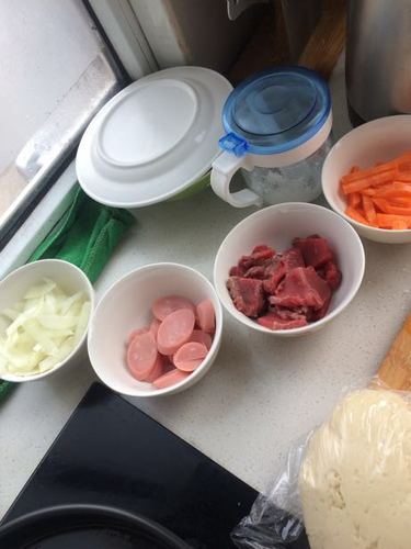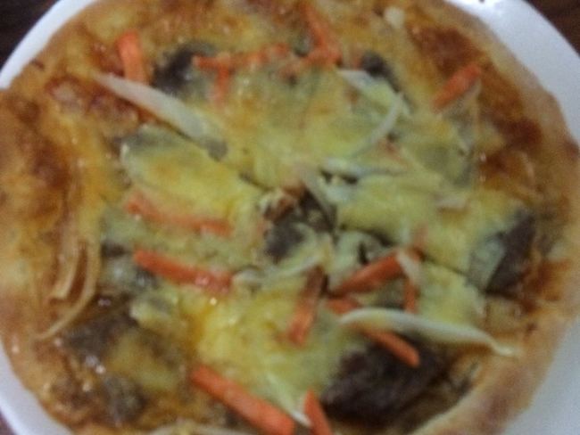 圆葱,胡萝卜,肉。披萨酱,芝士条。