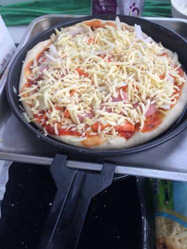拿出饼皮放入酱,一层芝士,圆葱胡萝卜肉,再一层芝士。烤10分钟左右。