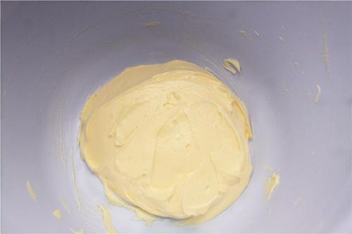 制作挞皮面团:黄油软化后筛入糖粉,用蛋抽搅拌到发白,体积稍大即可;