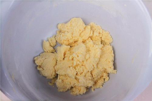 将低粉和盐分两次筛入,第一次筛入后用刮刀切拌至无干粉状态再加入第二次,继续切拌至松散无干粉状态即可,不需要成团;