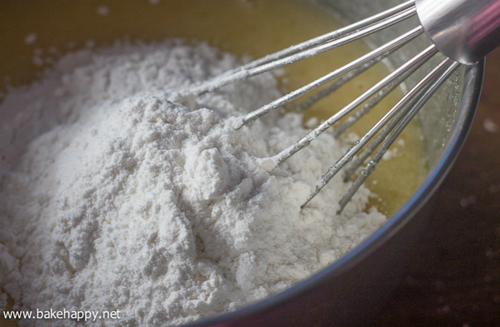 面粉,泡打粉和盐一起过筛,加入冷却的白巧克力混合物搅拌至面糊状;