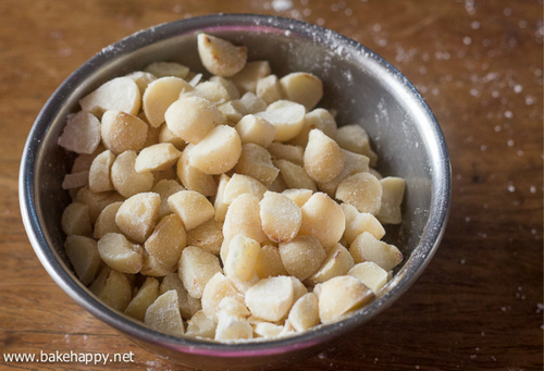 2、烤夏威夷果仁方法:烤箱预热至175度,铺上油纸,均匀地把夏威夷果仁平铺在烤盘上,烘烤约5分钟后,翻拌果仁,烤到果仁表面微微金黄即可。冷却切碎备用;