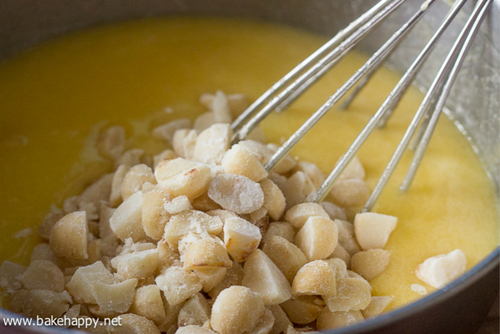 准备一杯夏威夷果仁碎,加入一茶匙面粉拌匀,倒入面糊中,搅拌均匀;