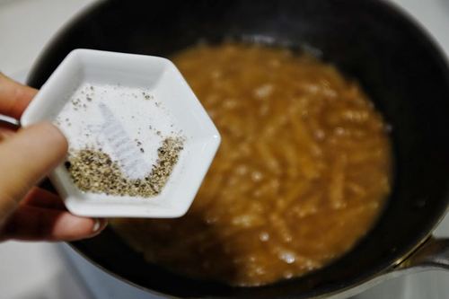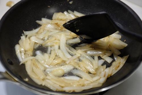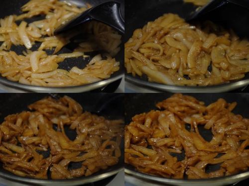 热锅凉油,将洋葱大火炒蔫后放入蒜末,洋葱稍微开始上色后,加入少量水,并用锅铲不停翻炒;随着洋葱的颜色逐渐变深,继续少量补水,并重复以上动作,直到洋葱炒成焦糖色;