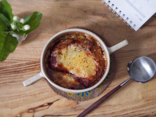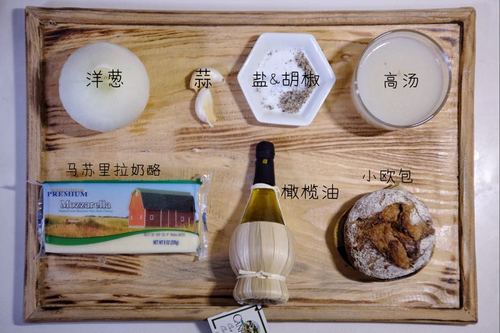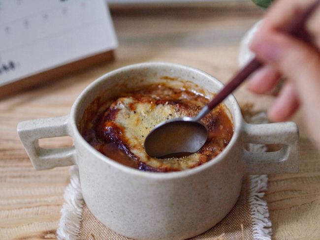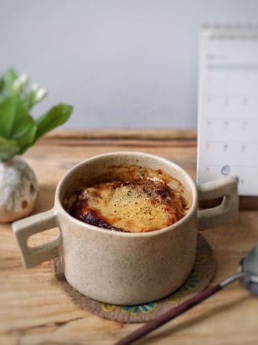 将步骤5中的汤盛入耐热容器中,约七分满,将烤好的面包片放在上面,撒上马苏里拉奶酪碎;