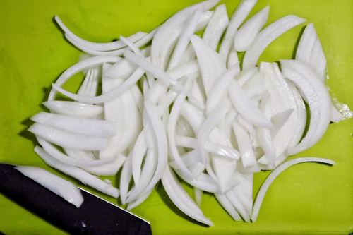 白洋葱去皮,切成约2-3mm的丝,尽量切成大小一样的,1/2大蒜子切碎;