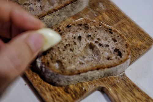 烤箱预热230°c,将面包切成8mm左右厚片,橄榄油和大蒜子末混合涂在面包片上,放入烤箱烤3分钟;