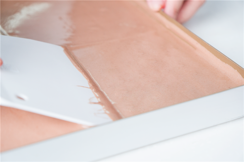 金盘内铺油纸,可可粉与低粉混合过筛两遍;所有冷藏材料都需要放至室温再使用,避免因为低温让巧克力凝固;