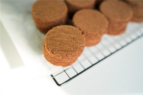 用大小合适的工具在蛋糕体上扣出一个个的原们;如果用的不是圆形切模,记得要轻轻转着圈压下去,不然小圆片会塌腰哦;