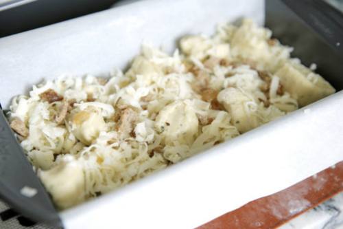 把每一部分面团揉成约75厘米的长条,再切成每个2.5厘米的小块,把1/3的面团块放入吐司盒,再倒入1/3的芝士碎,重复两次;