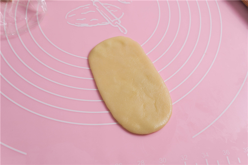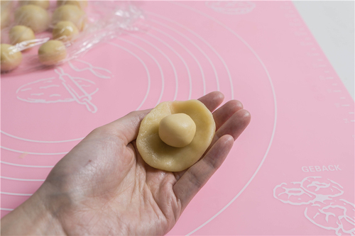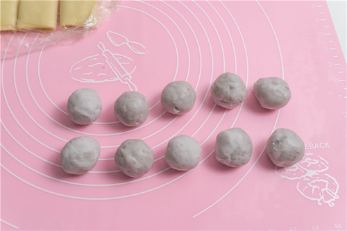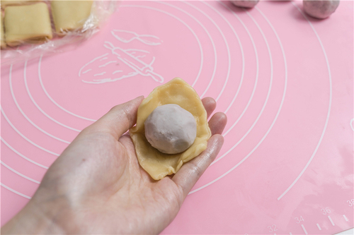 松弛期间,先将烤箱190℃预热;再把芋泥馅揉成小球,每个约20g;松弛完毕,取一份面团,稍微擀开,包入一份芋泥馅,收口收紧朝下,轻微按压使面团呈扁的圆饼状;