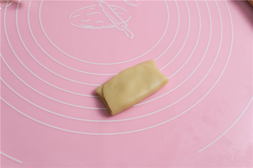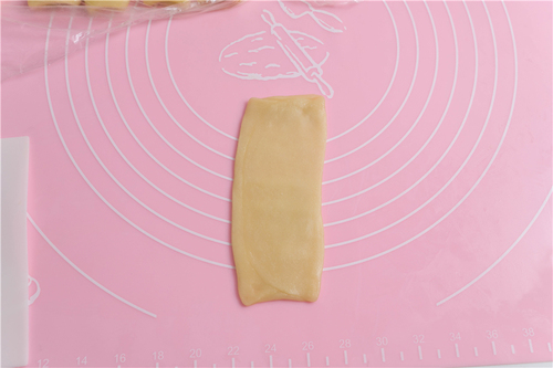 取一份面团轻微压扁,用擀面棍擀成长条状,再对其进行一个三折。每个都进行相同的操作,盖上保鲜膜继续松弛20分钟;