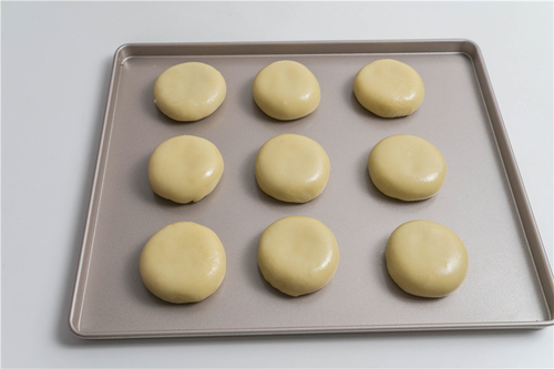 每个都包好后,盖上保鲜膜,继续松弛20分钟,松弛完毕后摆入烤盘;