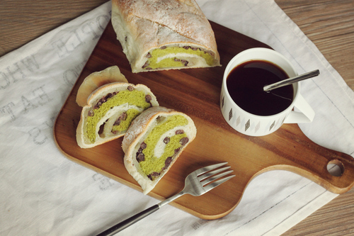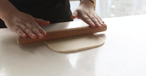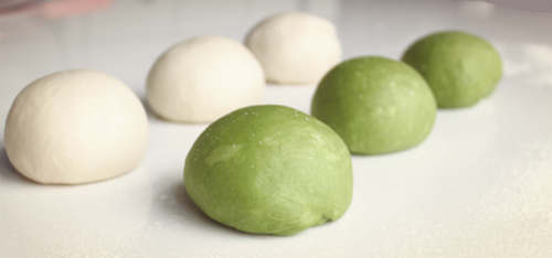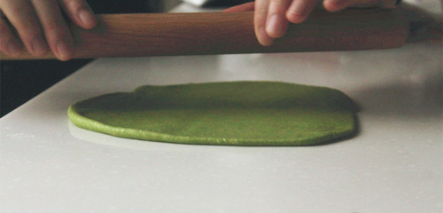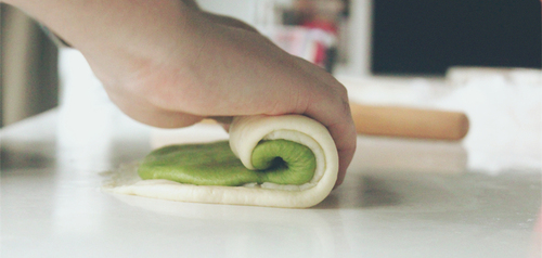 捏紧其中一端,将铺好的面片卷起来后,两端的收口捏紧,再整理成自己喜欢的形状;上述步骤再重复两次,将其余面团与麻薯卷好备用;收口捏紧一方面是为了美观,同时也为了防止抹茶面团因为烘烤过度而变色。
