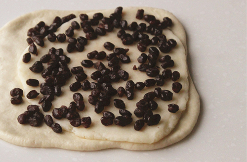再取一个绿色面团擀成长方形片状,厚度建议0.5cm左右,大小与麻薯片相当,要小于白色面片,擀好之后铺在蜜豆层的上方。