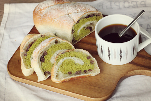 将高粉、砂糖、盐、酵母、奶粉放入揉面盆中,加水揉至表面光滑有弹性,分割成两个等量的面团;其中一个加入抹茶粉揉匀;