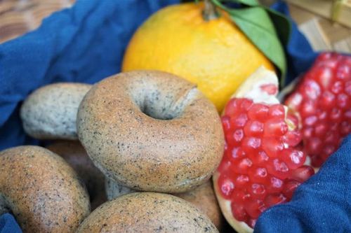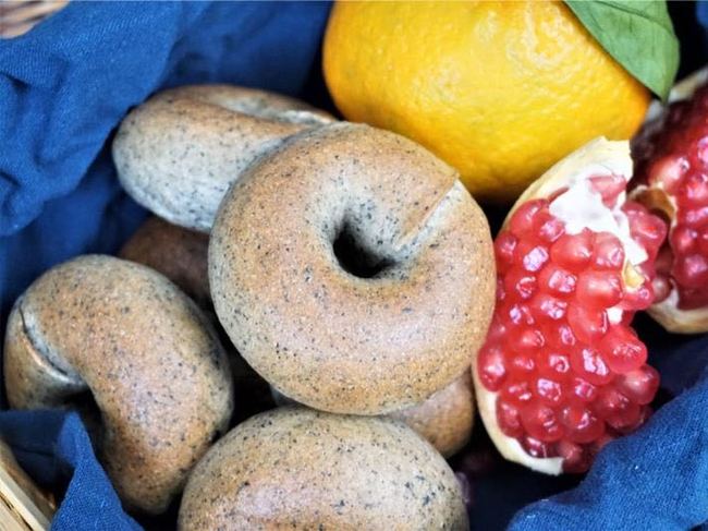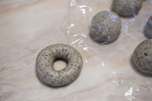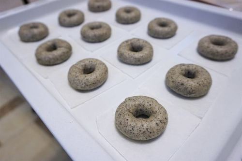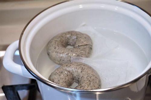 等二发结束后,取出烤盘,同时烤箱预热200℃。热水中一次放进2-3个贝果,掐表20秒,用筷子翻面,再掐表20秒,捞出,放烤盘上。油纸在煮的时候会自己转身离开,不用理它