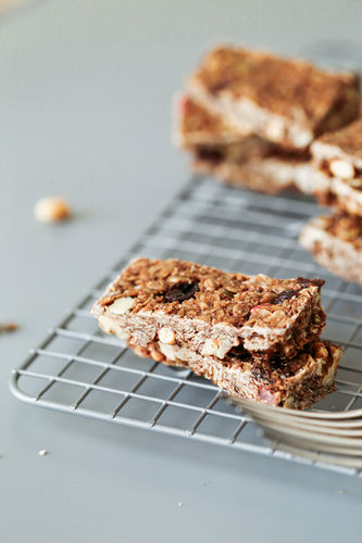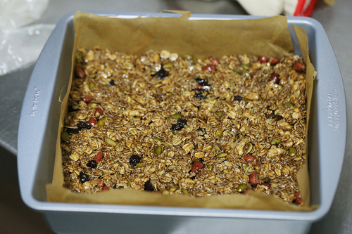 把混好的食材倒入模具中,均匀的稍稍用力压紧食材;接着放入烤箱中层转170°上下火烤20分钟,取出放凉即可切块;