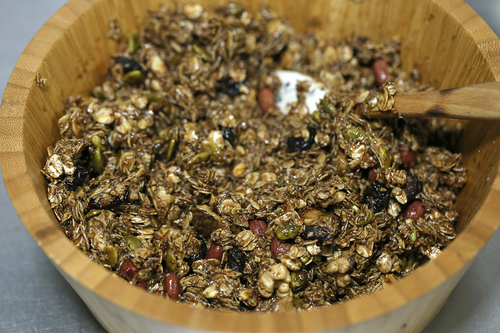 再加入步骤2中煮好的混合液、蜂蜜并充分拌匀,保证每一个角落的食材都被液态材料包裹住;