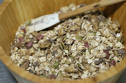 燕麦、花生、核桃、南瓜子仁放入烤箱200°烤出香味;