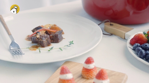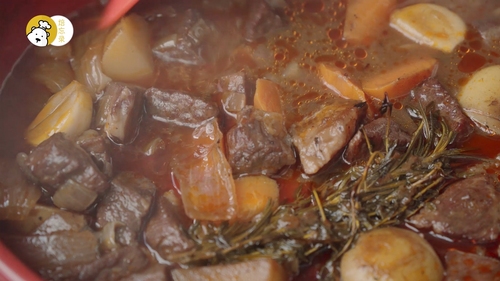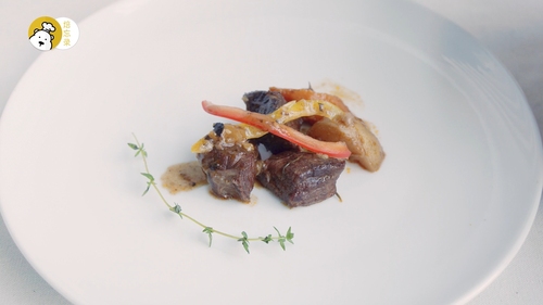 热锅,放入黄油融化,把准备好的牛肉放入锅中煎至表面变色,沥油后捞出备用;视频中用的锅是法国海淘回来的好物,大家也可以用铸铁锅、能进烤箱的陶锅都是OK的;