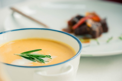盛一碗南瓜浓汤,滴几滴奶油在表面,放一段迷迭香做装饰;牛肉可以直接吃,也可以做成很有仪式感的法式装盘,反正怎样都好吃;