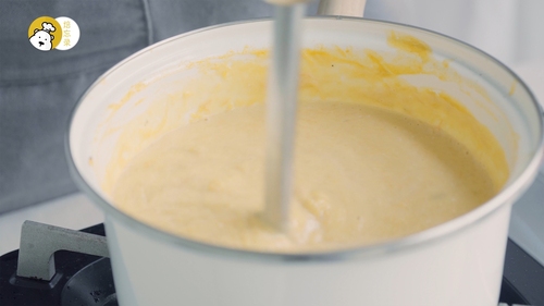 汤变得粘稠后,用手持料理棒伸进锅中,慢慢地搅打汤汁,变成浓稠顺滑的状态即可离火备用;如果追求细腻丝滑的口感,可以把整锅汤倒进破壁机中搅打;