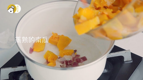 炖牛肉的过程中可以准备南瓜汤:锅中放黄油,烧热后放入洋葱碎,爆香,再加入蒸熟的南瓜,翻炒出香味;要注意,用锅铲将南瓜尽量碾碎;