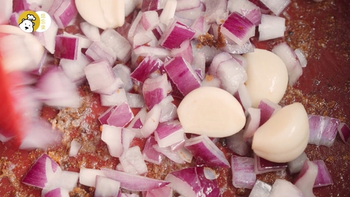铲一下锅底的碎渣(不用捞出,会让菜更香的),放入切成小块的洋葱、蒜瓣爆香,再加入胡萝卜、土豆、洋葱块翻炒至上色,再加入牛肉混匀;