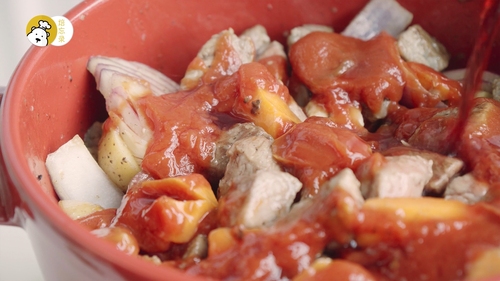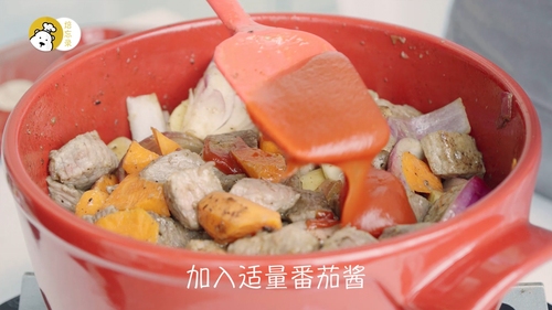 加适量番茄酱,再倒红酒,淹没所有食材,翻拌均匀;把百里香、迷迭香捆在起来,放入锅中,炖煮至汤汁沸腾;