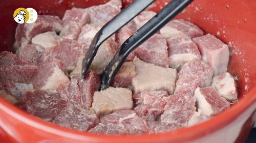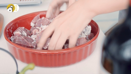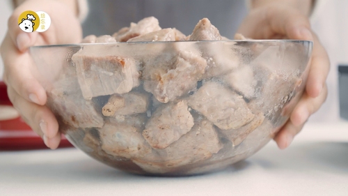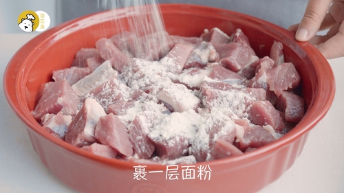 撒入海盐,用手揉搓牛肉至海盐粒消失,再撒一层面粉,把牛肉表面均匀的沾裹上粉;
