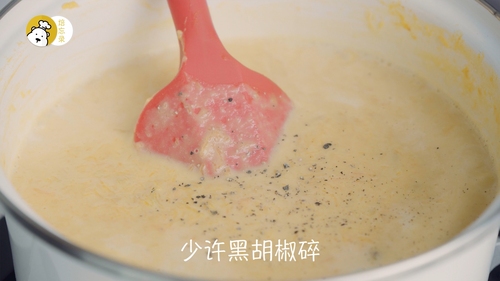 把淡奶油、牛奶倒进锅中开始烹煮,再撒一些黑胡椒,全程保持中小火;