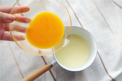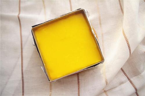 冷冻差不多后,开始准备淋面。百香果汁加入糖、饮用水,融化均匀,吉利丁隔热水融化加入果汁中搅拌均匀,取出冻好的慕斯浇入淋面。这个淋面是比较薄,如果你喜欢比较厚的淋面,可以自己增量。