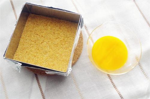 先将慕斯圈用锡纸包好底部。将消化饼碾碎,混合融化的黄油后铺在慕斯圈底部,放入冰箱冷冻待用。