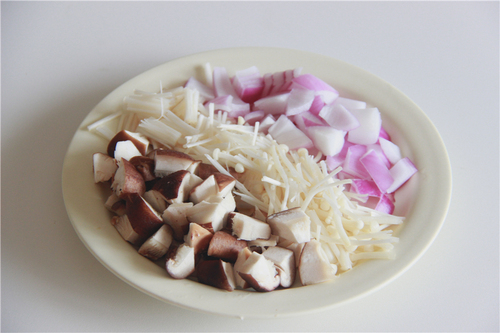 准备好所有材料。洋葱和菌菇洗净、切丁备用,这里我们用了香菇和金针菇;