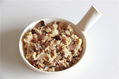 将油烧热,先把洋葱下锅,炒出香味后加入菌菇,菌菇变软炒熟后加入米饭,将米饭炒散后加入耗油、盐、黑胡椒调味后,加入四分之一分量的芝士碎拌匀即可起锅,将炒好的饭平铺在烤碗中;