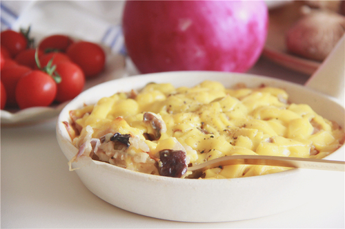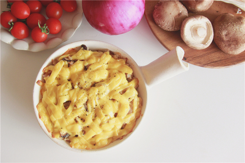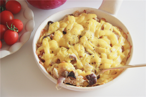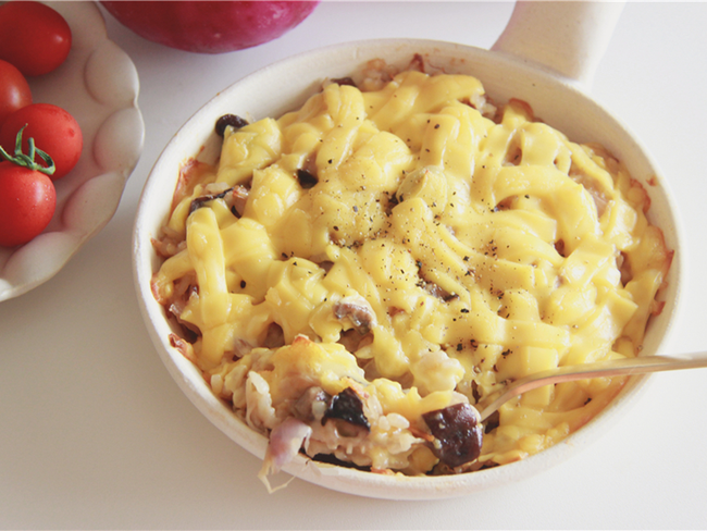 烤好的焗饭要趁热吃最美味,食用前可以根据自己的口味撒少许黑胡椒粉或欧芹粉。