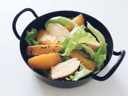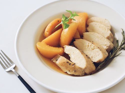 取出后切块,和黄桃一起摆盘,也可以浇一些过滤后的汤汁。也可以用烤好的鸡胸和黄桃一起拌在沙拉中大快朵颐;