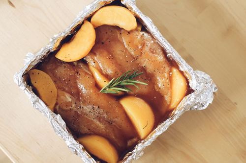 将鸡胸放在烤盘中,黄桃放在周围,汤汁浇在鸡肉上;
