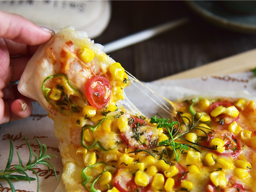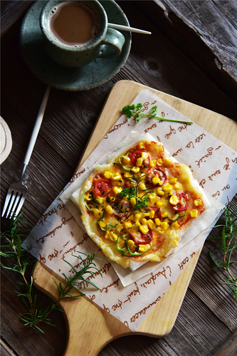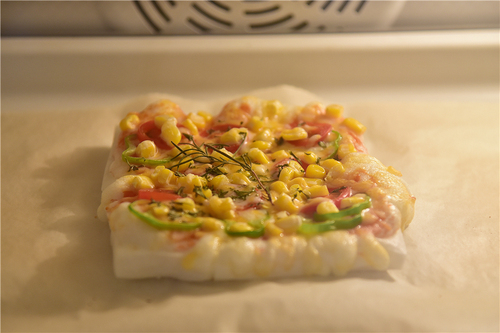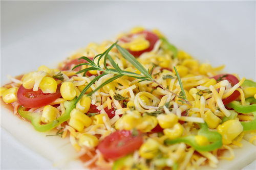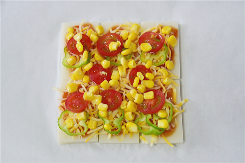 撒一层芝士碎,把切好的材料跟玉米粒平铺上去;