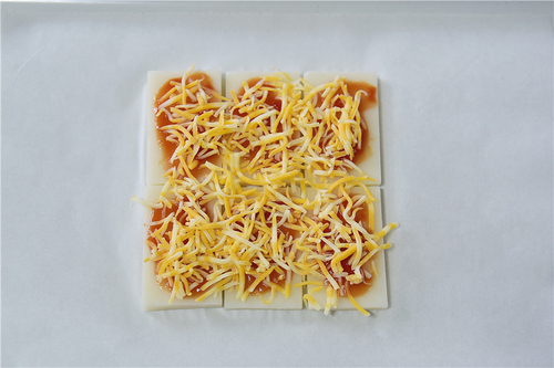 烤盘上垫一张烤纸,将年糕平铺在烤盘上,每块中间留一点点小缝隙,年糕的表面涂上少许番茄酱;