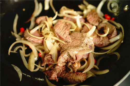 2、放在锅里炒的牛肉记得不要炒到全熟,5分熟即可,不然后面再放入烤箱烘烤后就老了;