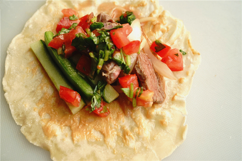 组装:在饼底均匀地抹一层蛋黄酱/墨西哥辣酱(可以根据自己的口味来),依次放上青椒/黄瓜、牛肉、Salsa酱;