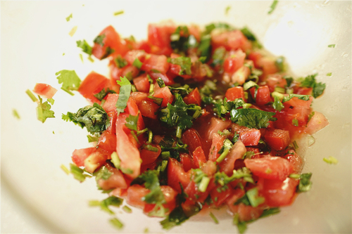 制作Salsa酱:番茄切丁,香菜切碎,混合均匀,加入黑胡椒、盐、橄榄油,挤入几滴柠檬汁,搅拌均匀;