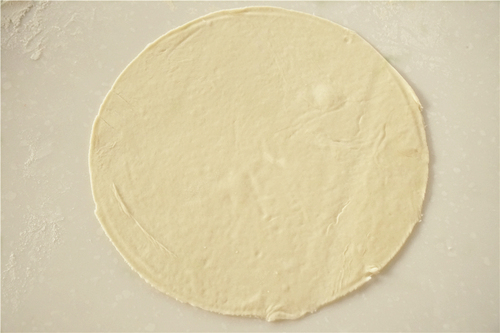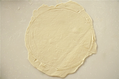分割成每个25g左右的面团,揉圆,再静置10分钟后,擀成薄饼,尽量擀薄。用盘子或者锅盖盖着,拿小刀划出圆形,去掉多余的饼皮;