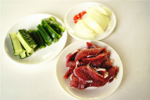 牛肉切块,加入少许盐和黑胡椒调味,小辣椒切碎、洋葱、青椒、黄瓜切成条状备用;