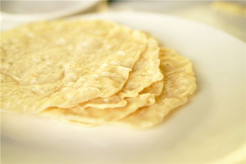 中火烧热不粘锅,放入饼皮,烙至微微上色,有小气泡鼓起;快速翻面再烙一会儿,出锅;