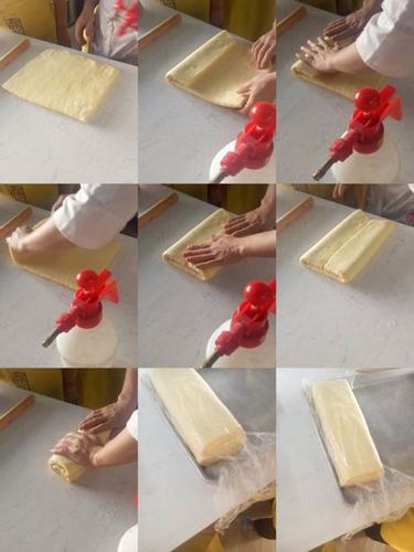 面团和片状甜酥油一起开酥4×4,稍微擀开,面上洒水,两边对折三分之一,再洒水,对折起来,冷冻松弛半个小时