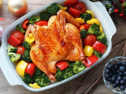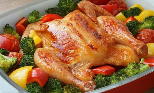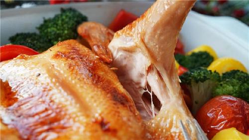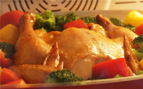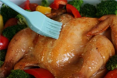 35分钟烘烤结束后,取出烤鸡,将红黄色彩椒块、西兰花摆在鸡的周围,同时在鸡的表面刷一层蜂蜜;蔬菜表面再刷一层橄榄油;