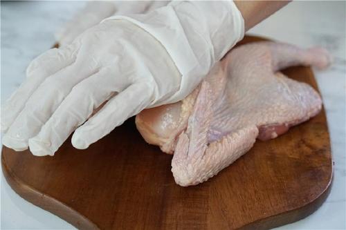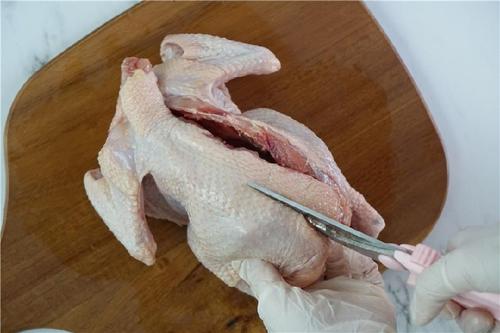 取出腌制好的鸡,鸡背朝上。用家禽剪从鸡的脊椎骨两边剪开,把脊椎骨连鸡脖一起去掉;接着将鸡翻转过来,鸡胸朝上,展开两边。此时鸡胸部分仍会隆起,用手掌用力按压使鸡胸软骨断开,摊平;